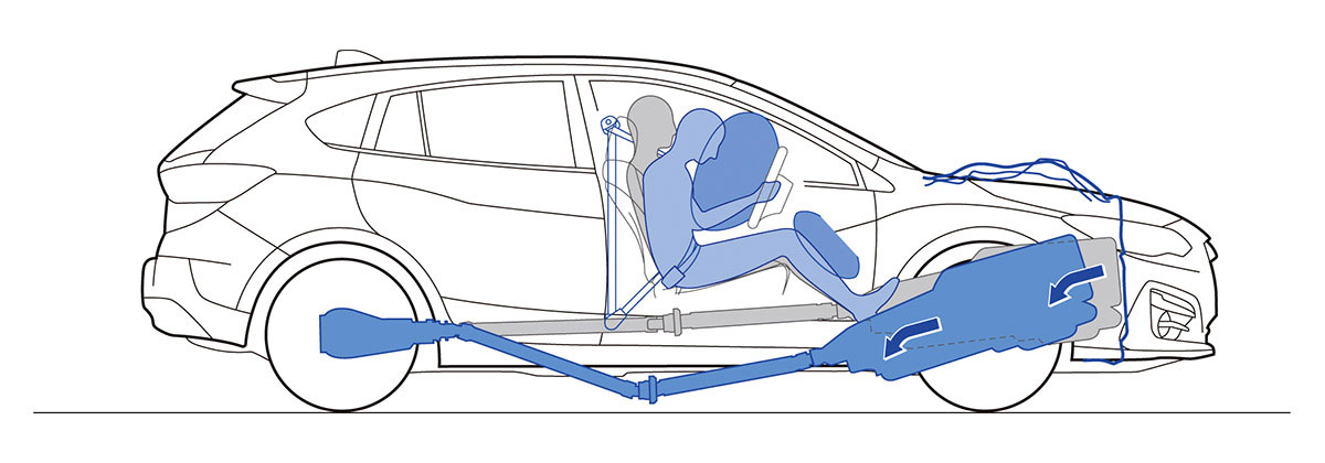 Symetryczna budowa platformy składającej się z systemu Symmetrical AWD i silnika SUBARU BOXER (o płaskiej budowie) pozwala chronić pasażerów przed wstrząsami, skutecznie wykorzystując całą konstrukcję podwozia jako tego obszaru, który podczas wypadku ulega zmiażdżeniu. Dodatkowo specjalna konstrukcja skrzyni biegów oraz odpowiednio dobrany sposób mocowania podzespołów sprawiają, że w razie zderzenia czołowego zespoły te „chowają” się pod samochód, nie przedostając się do wnętrza kabiny.